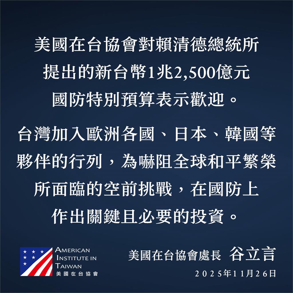 總統賴清德投書《華盛頓郵報》,表示在區域安全情勢升高之際,台灣將持續提升自我防衛能力,並將提出「史無前例」的400億美元(新台幣1.25兆)特別預算案。對此美國在台協會(AIT)處長谷立言透過社群媒體表示歡迎,並稱這是「關鍵且必要的投資」。
