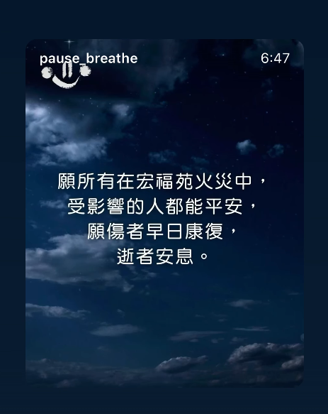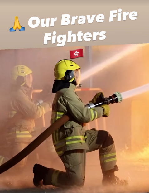 舒淇深夜在IG發文,以黑底加上雙手合十的符號,為香港大火表達哀悼之意,也祈求火勢速退、平平安安,致敬英勇消防員們,願逝者安息,在圖片中也附上相關救濟服務資料,透過公眾人物的力量,協助援助訊息分享。馮德倫、謝霆鋒則在限時動態向消防隊員們致上敬意;梁詠琪、張柏芝、鄧紫棋等人也先後PO文致哀及祈福。