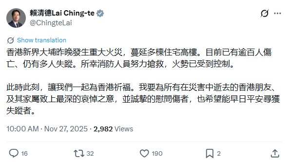 賴清德今日在社群平台X發文寫道,香港新界大埔昨晚發生重大火災,蔓延多棟住宅高樓,目前已有逾百人傷亡、仍有多人失蹤,所幸消防人員努力搶救,火勢已受到控制。「此時此刻,讓我們一起為香港祈福。」同時也為所有在災害中逝去的香港朋友及其家屬致上最深的哀悼之意,並誠摯的慰問傷者,也希望能早日平安尋獲失蹤者。