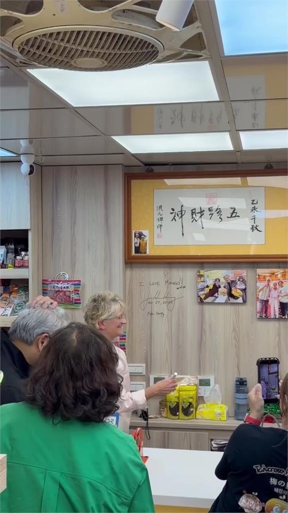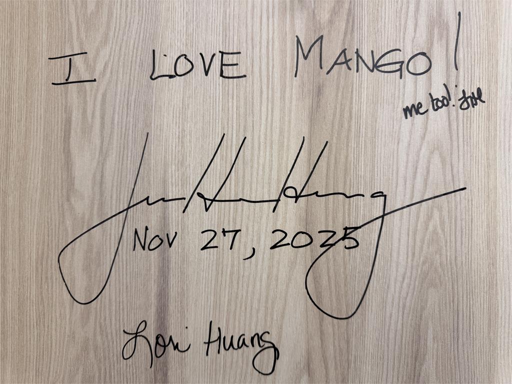 黃仁勳與老婆在店內簽名。圖/業者提供隨後黃仁勳也在台北四平街一帶被人目擊,當下他正在購買蜜餞,還與老婆在店內留下簽名,簽名上方還寫著「我愛芒果」,老婆也在旁邊留下「Me too」,相當可愛。購買蜜餞過程中也有大批民眾詢問是否能合照,黃仁勳也來著不拒,大方與民眾合照,展現十足親和力。