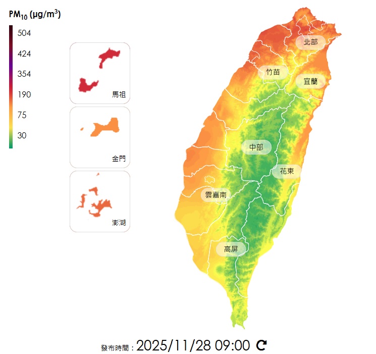 環境部也發布空品提醒,馬祖地區空氣品質達到紅色警示等級,呼籲所有族群都應減少在戶外活動;西半部、宜蘭、冬山、花蓮地區以及馬公、金門地區則為橘色提醒等級,建議敏感族群減少在戶外從事劇烈活動。