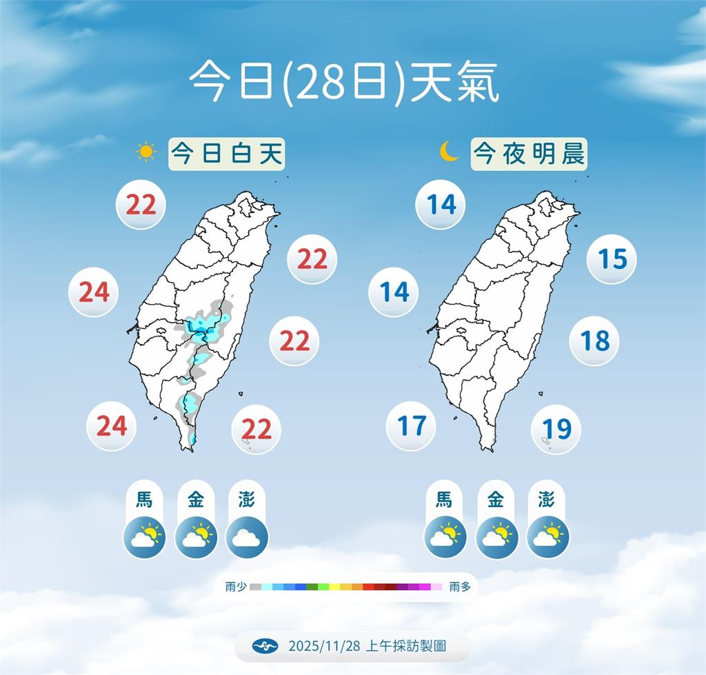 受東北季風影響,今(28)日各地天氣偏涼,北部及東半部高溫約22度,中南部約24度,雲量整體偏多。氣象署資深預報員李孟軒指出,今天平地以飄雨為主、山區降雨較多,中南部山區及花東、東半部都有局部降雨,南部則有零星雨勢。李孟軒說,到了今晚到明(29)日清晨,南方雲系有減少趨勢,天氣將轉趨穩定,不過在輻射冷卻影響下,中部以北及東北部清晨低溫約14至15度,近山區平地可能更低;南部及花東則約17至19度。