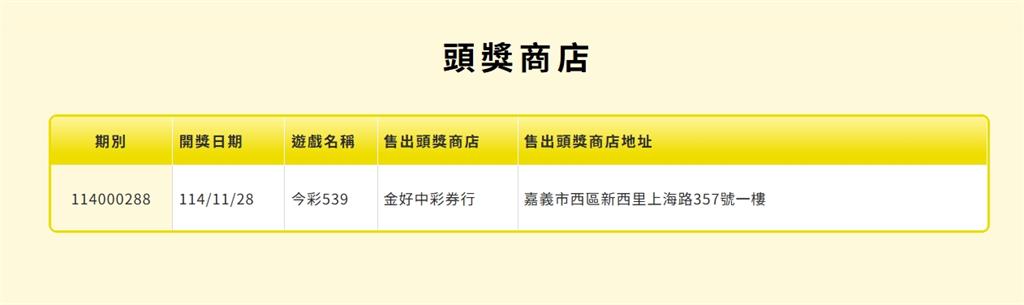 台彩今(28)日派彩結果出爐,今彩539頭獎開出1注,獎金8百萬元,由嘉義市西區新西里上海路357號一樓「金好中彩券行」開出。