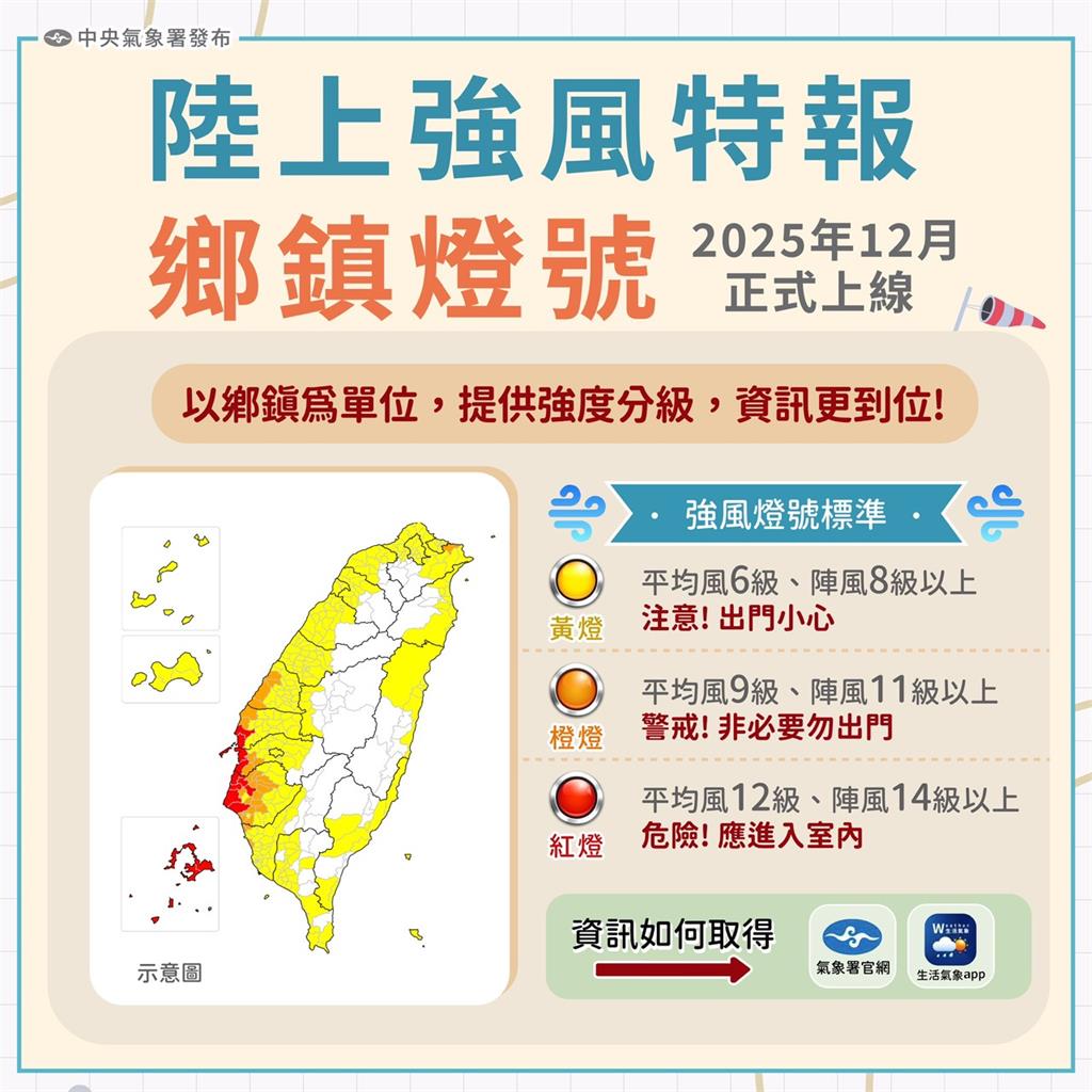 陸上強風特報鄉鎮燈號即將於12月正式上線。圖/中央氣象署提供