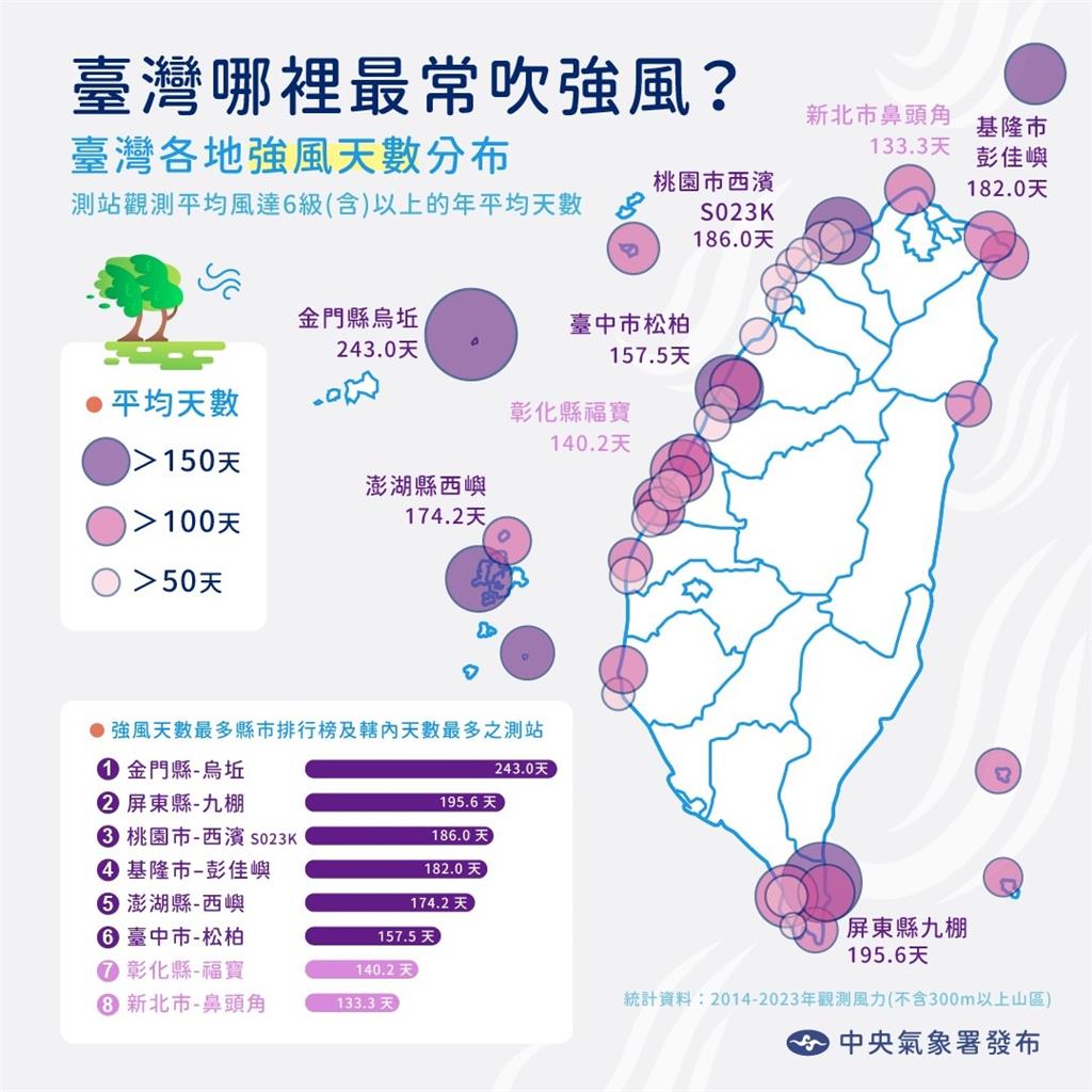 台灣時常出現強風的區域與天數分布。圖/中央氣象署提供羅雅尹說明,不同風級的影響差異不同,6至7級風出門即可感受到明顯風勢,撐傘可能變得困難;8至9級風時,未固定物品可能被吹落;10至11級風則建議減少戶外活動,大型物品或樹木可能被吹斷;12級以上風勢更容易造成顯著災害,多出現在颱風侵襲或登陸時。