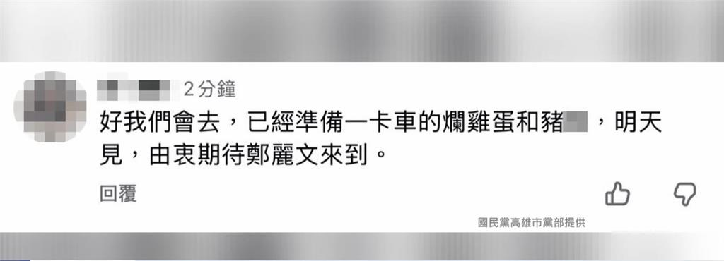 網友留言恐嚇蛋洗迎接鄭麗文。圖/國民黨高雄市黨部提供「不喜歡藍色」 6旬網友退休無業留言恐嚇遭逮