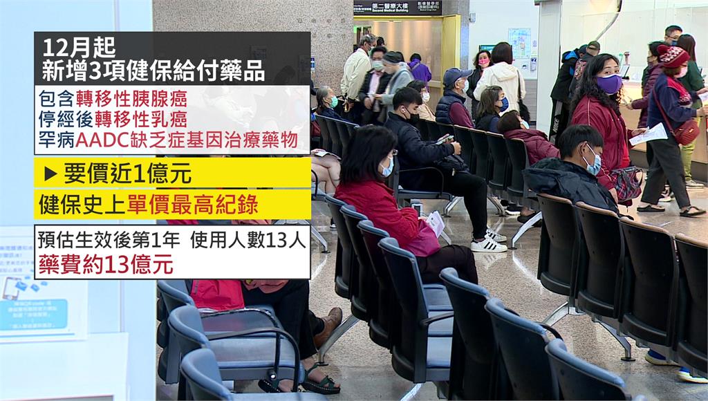 在醫療方面,衛福部公告自12月起新增3項健保給付藥品,其中罕病AADC基因治療藥物單劑要價近1億元,創下健保史上單價最高紀錄,預估新制上路後第1年,使用人數約13人,藥費約13億元。