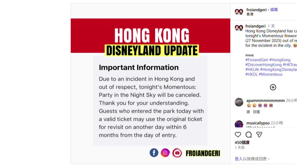 香港迪士尼取消高空煙火。圖/翻攝自IG國際中心/綜合報導 責任編輯/網路中心
