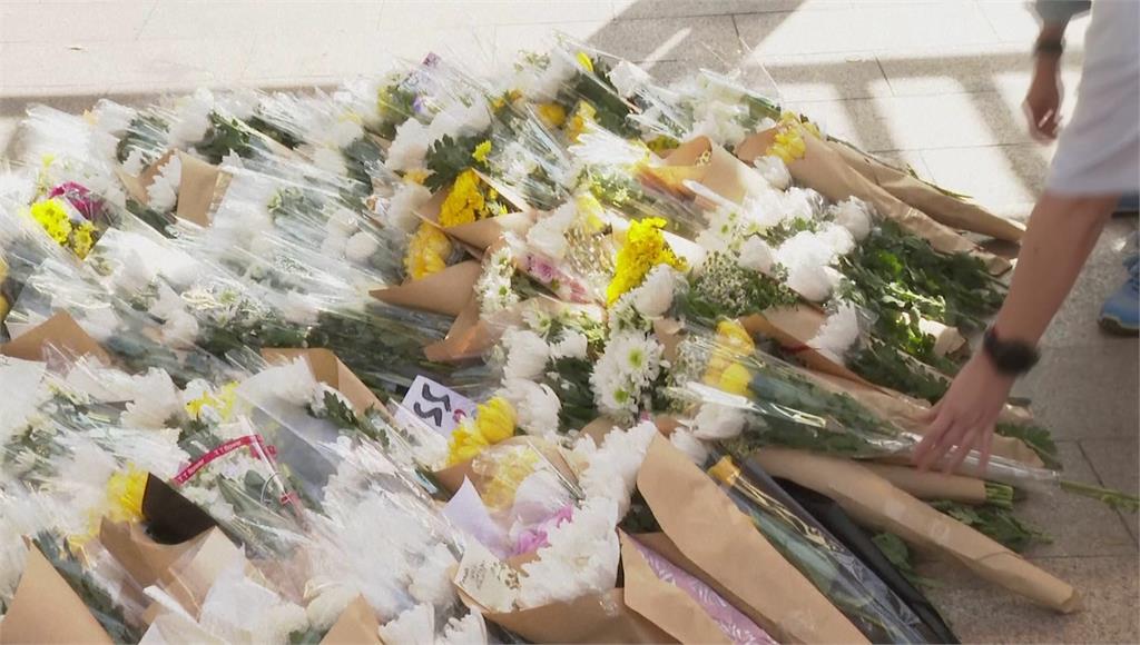 志工湧社區廣場提供物資 地上擺滿祝福鮮花+紙鶴