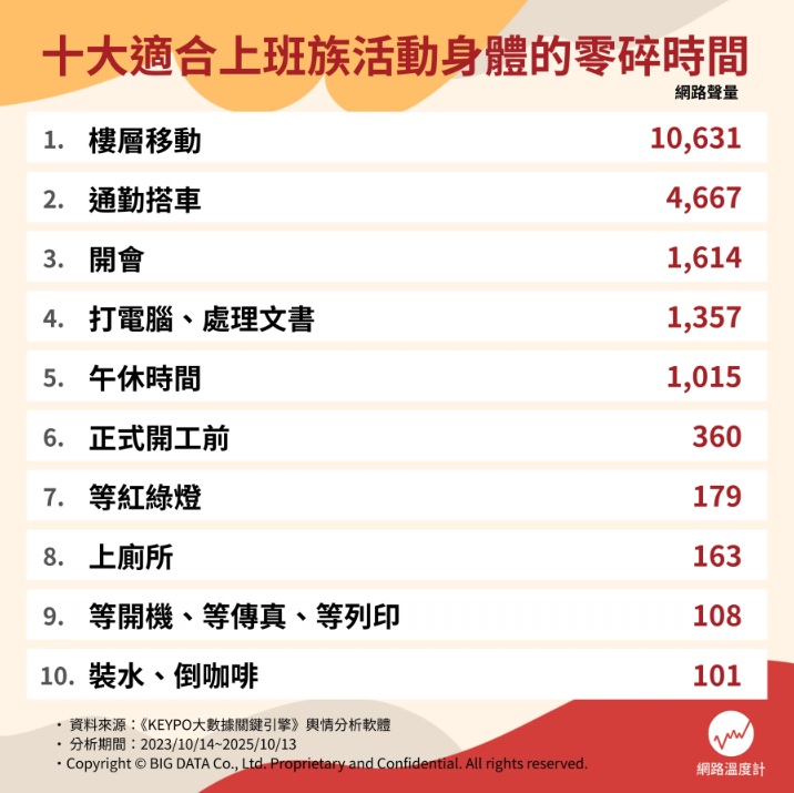 《網路溫度計DailyView》透過輿情分析軟體《KEYPO大數據關鍵引擎》,整理出上班族十大零碎身體活動時間,透過網友和醫生分享,動作簡單、不挑場地,短時間就能舒緩緊繃肌肉、讓大腦重新充電。像午休時出門走走、執行站立式開會、上下樓改爬樓梯等,讓我們一起輕鬆甩掉三高風險,累積健康能量吧!