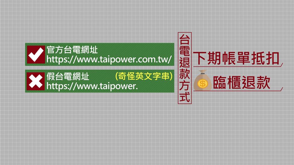 刑事局公佈近期時常發生的詐團新招。圖/台視新聞台電也在臉書粉絲專頁發布警訊,強調目前電費退款僅有兩種方式,第一是直接於下一期帳單中折抵,第二種則為臨櫃辦理退款。刑事局補充,詐騙網址雖然可能帶有台電英文縮寫,但後方往往夾帶一長串異常英文字母或亂碼,可作為判斷依據之一。