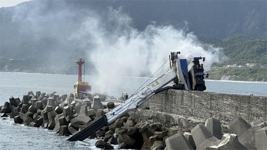 台東成功漁港今(30)日中午多發生吊車翻覆意外,一輛吊車在碼頭進行消波塊吊掛作業時,疑似失衡整台側翻,吊臂直接插進海面,車身卡在堤防上。駕駛明顯死亡,副駕駛則是腳被夾住,已送醫院治療,但在救援時吊車疑似漏油冒出火苗,所幸有控制住。