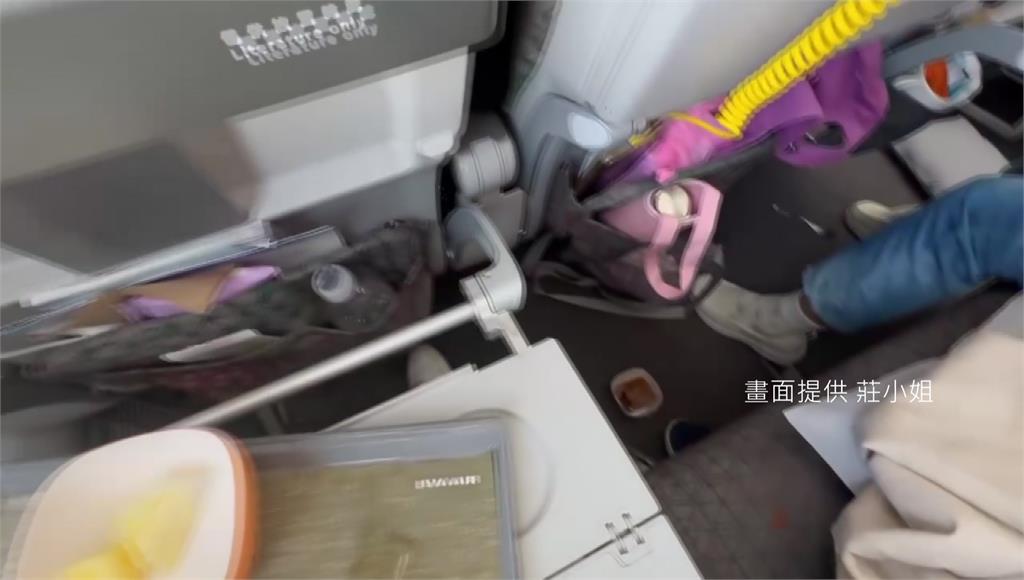 事發當下桌上的餐點掉落在地。圖/莊小姐提供YouTuber劉瑆當時也在機上,直言感覺就像在搭雲霄飛車。她表示,飛機上下劇烈搖晃約兩、三次,之後還伴隨左右搖晃,眼前乘客的飲料和餐點整個被震到飛起來。機長廣播說明,班機遭遇雷雲與雲雨區,他嘗試尋找可穿越的空隙,但仍無法從中間安全穿過。