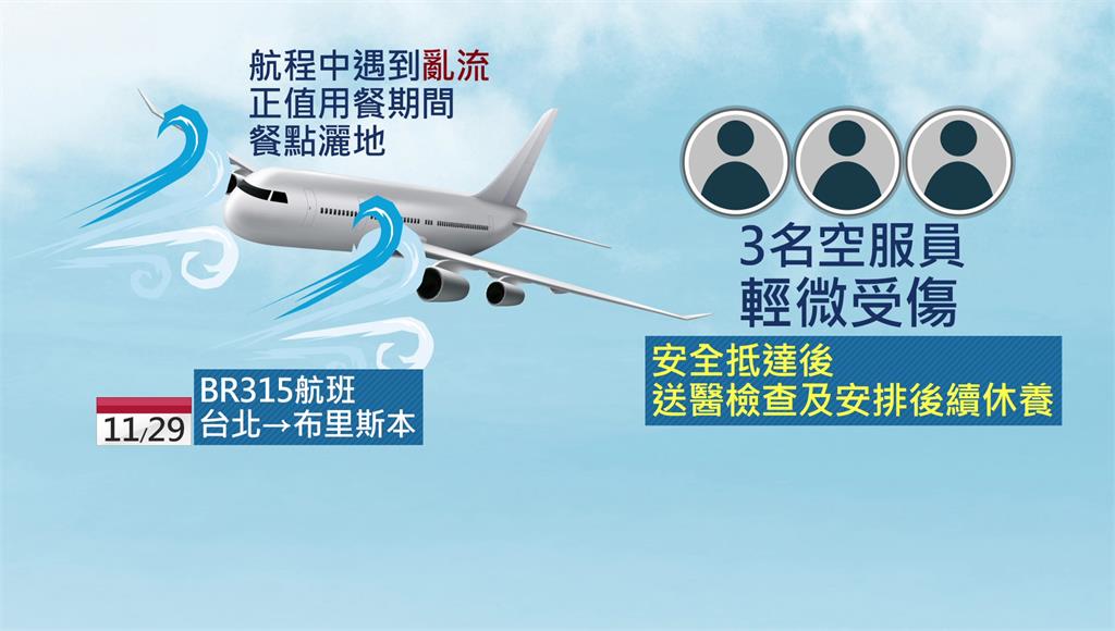 這架班機於11月29日從台北飛往布里斯本,航程中遭遇亂流,不僅乘客受到驚嚇,當時執行服務的3名空服員也輕微受傷。航班安全抵達後,傷者皆送醫檢查並安排後續休養。