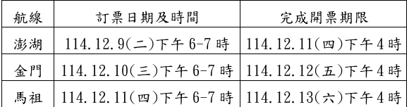 為利旅客規劃行程,民航局說明,澎湖、金門及馬祖管制航線航班將分別於12月9日(週二)、10日(週三)及11日(週四)下午6時到7時開放受理旅客電話訂位及網路訂位購票。透過航空公司網站購買離島返本島機票亦可免除5%營業稅。