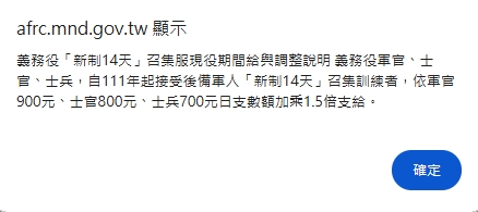 召集資訊查詢平台。圖/後備軍人網路服務臺國防部在教召期間也會給予應召人員薪俸,新制14天召集訓練者,依軍官900元、士官800元、士兵700元日支數額加乘1.5倍支給。