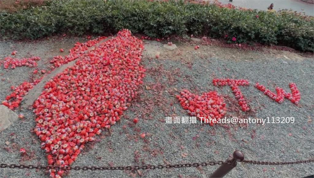 不顧勸阻,疑似穿著粉色大衣的中國籍的女子,直接越過圍籬,把排成Taiwan英文縮寫的達摩一一打亂,一旁親友攔不住,女子換個位置,再破壞排成台灣形狀的達摩。女子失控行為引起圍觀,直到親友強行將她拉走,才結束鬧劇。