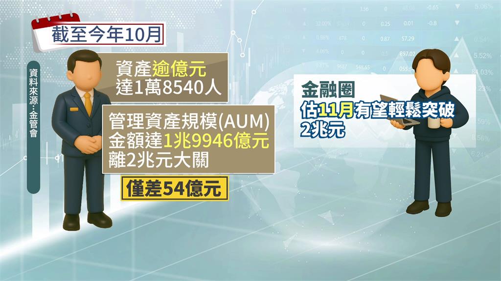 金管會統計,資產破億元的「好野人」人數持續增加中,截至今年10月已經有1.8萬人,而這些富豪們的資產規模統計來到1兆9946億元,距離2兆元大關只剩下54億元就能突破,金融圈預期,以目前成長速度來看,11月就可以輕鬆突破,超額儲蓄明年更能達到5兆元以上,也象徵財管市場已全面邁入新兆元時代。