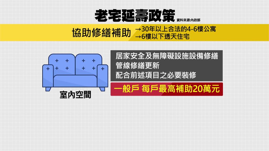 內政部推出老宅延壽政策。圖/台視新聞不過,想申請老宅延壽補助必須符合一定條件。以公寓為例,至少要有一半為住宅,而非公司或法人空間,戶籍內也須至少有一名65歲以上長者,或屬於中低收入戶,才符合申請資格。