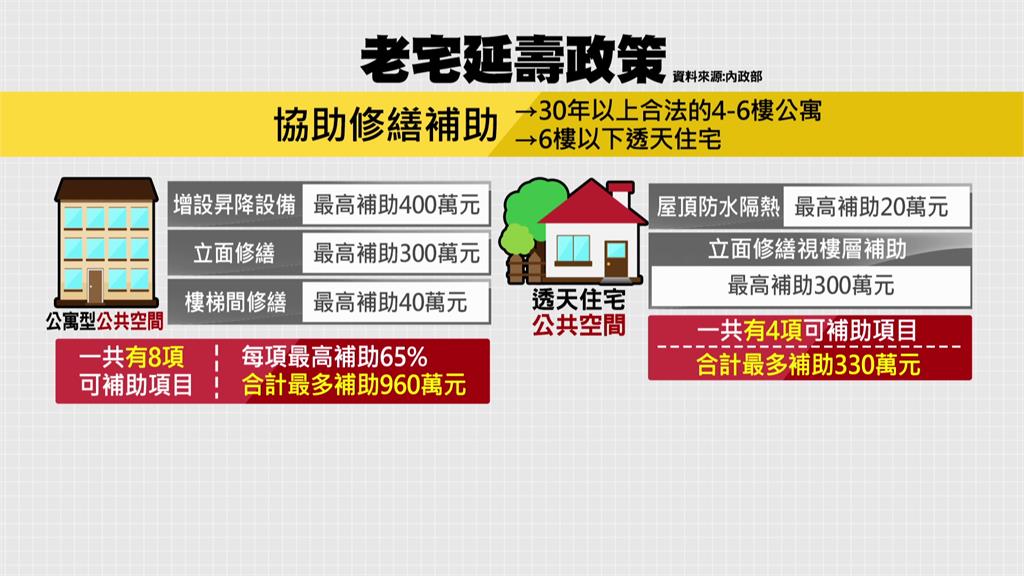 依照規劃,公寓的公共空間可申請多項補助,包括加裝電梯、外牆立面修繕、樓梯間及公共管線更新等,共有8項可補貼項目,每棟最高補助金額可達960萬元。如果是透天厝,則以屋頂防水隔熱、立面修繕等4項補貼為主,最高補助330萬元。