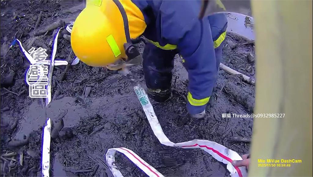 現場熊熊烈火持續燃燒,火勢驚人。圖/翻攝自Threads@angel_yang為防止高溫悶燒,現場出動怪手進行開挖,但泥濘不堪,地面布滿厚重泥沼,消防人員在處理殘火時,必須小心涉險前進,隊員一邊拉水線一邊穩住腳步,而後方的義消雙腿幾乎深陷泥沼,艱難而堅毅地支援救火工作。