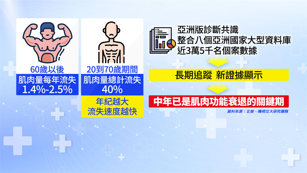 研究團隊指出,60歲以後肌肉量每年流失1.4%-2.5%,20到70歲這50年間,肌肉量總計流失約40%,年紀越大流失速度就會越快,這份亞洲版診斷共識整合八個亞洲國家大型資料庫,有近3萬5千名個案數據,長期追蹤發現,「中年已是肌肉功能衰退的關鍵期」。