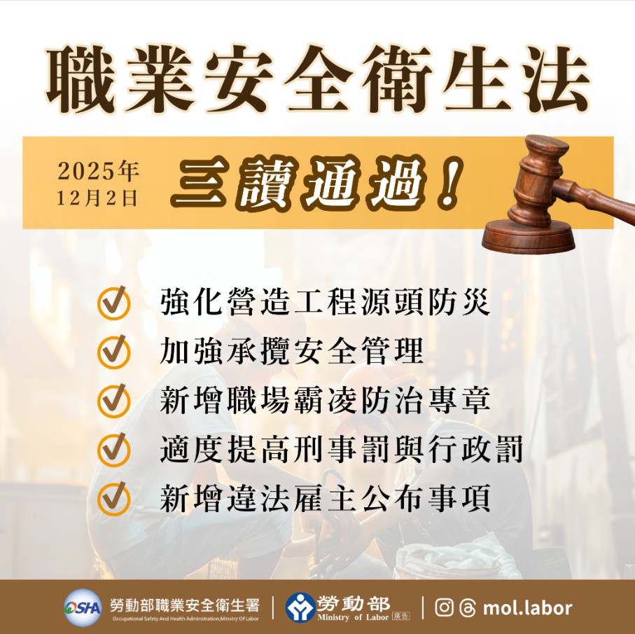 立法院三讀通過《職安法》修正案,共計修正25條文,其中新增6條文,是自102年職安法全文修正以來最大幅度的調整。勞動部指出,本次職安法修正重點包含強化營造工程源頭防災、加強承攬安全管理、完善職場霸凌防治、提高處罰額度,以及增訂違法雇主違反法條及罰鍰金額等公布事項。勞動部長洪申翰表示,本次修法主要核心在於「工安預防全面化」及「職場霸凌法制化」,是提升我國整體勞動環境的關鍵行動。
