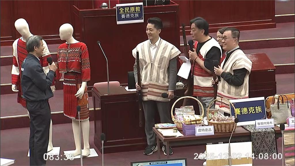蔣萬安和李四川議會備詢時穿上賽德克族戰袍。圖/翻攝自youtube@臺北市議會接著李傅中武說此次質詢準備了賽德克族狩獵文化體驗,邀請蔣萬安和李四川來體驗,他遞給兩人獵槍,還貼心幫忙上膛,教導兩人如何對面前的山豬玩偶開槍,三人就這麼直接在議會現場「獵山豬」,引發現場逗笑。