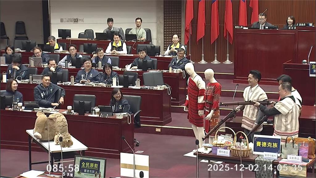 今(2)日下午台北市議會出現有趣一幕,原住民議員李傅中武邀請台北市長蔣萬安和副市長李四川穿上賽德克族的戰袍備詢,還邀兩人一起體驗狩獵山豬,三個人在議會現場拿起獵槍射山豬娃娃。體驗完李傅中武還故意說蔣萬安、李四川非原民身分卻非法持有獵槍,要警察局長李西河將兩人帶走。