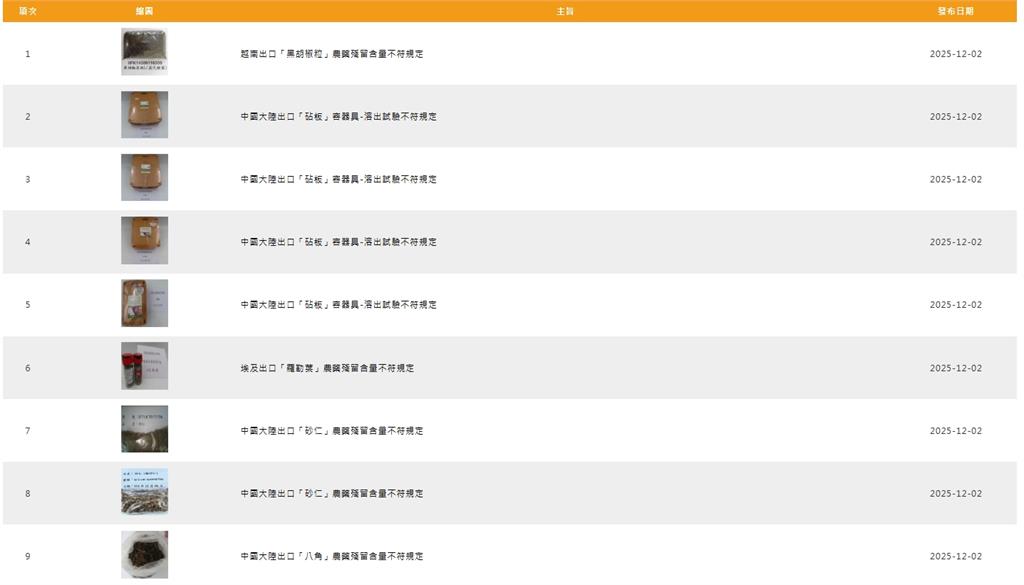 食藥署此次檢驗,共有23項產品不合格。圖/食藥署提供這波不合格的產品共有23項,分別是越南出口「黑胡椒粒」、中國大陸出口「砧板」容器具4項、埃及出口「羅勒葉」、中國大陸出口「砂仁」2項、中國大陸出口「八角」、中國大陸出口「乾青蔥」、斯里蘭卡出口「薑黃粉」、瑞士出口「乾酪」、中國大陸出口「紙皮烤核桃」、韓國出口「熱狗紙盒」、印度出口「高梁」、越南出口「荔枝凍果」、越南出口「西芹」、印尼出口「香蕉片」、越南出口「榴槤果肉」、巴拉圭出口「白芝麻」、越南出口「糙米」、印尼出口「冷凍透抽」、澳大利亞出口「硬粒小麥」。