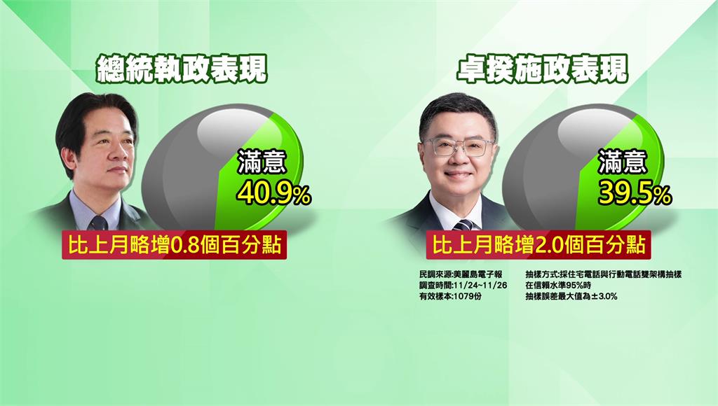 《美麗島電子報》於11月底進行的調查發現,國人對總統賴清德在執政方面的滿意度突破四成,比前一個月略增0.8個百分點,從民調中也可看出,大罷免之後滿意度持續上升;行政院長卓榮泰的施政表現同樣呈現回升,本月來到39.5%,比前一個月增加2個百分點,已接近大罷免投票前的評價。