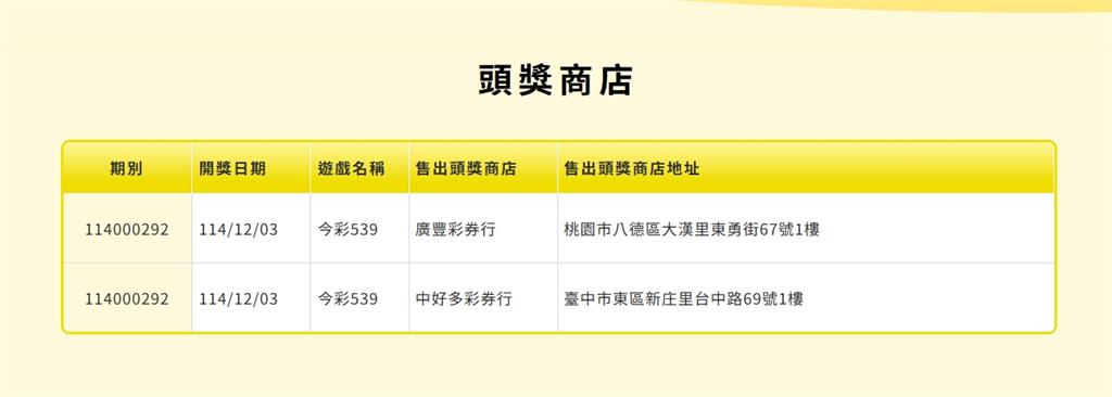 台彩今日派彩結果出爐。圖/台視新聞(資料畫面) 今彩539今(3)晚獎號開出05、09、14、33、35,派彩結果出爐,頭獎開出2注,每注獎金8百萬,分別從桃園八德區「廣豐彩券行」、台中市東區「中好多彩券行」開出。開出頭獎彩券行。圖/翻攝自台彩官網12/03台彩獎號:.今彩539:05、09、14、33、35。.39樂合彩:05、09、14、33、35。.3星彩:725。.4星彩:2253。確切中獎號碼及派彩結果以台彩官網公布為主。責任編輯/陳俊宇