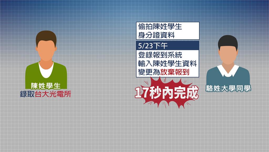 陳姓學生發現系統顯示「放棄報到」,隨即報案並向台大反映。圖/台視新聞但檢警追查發現,竟是陳姓學生的大學同學所為,他先是偷拍陳姓學生的身分證資料,接著5月23日下午登錄報到系統,輸入陳姓學生的資料,變更為「放棄報到」,前後只花了17秒就完成操作。事件爆發後引發不少網友批評,「完成報到後,竟能被他人取消」,質疑台大報到系統的安全性。