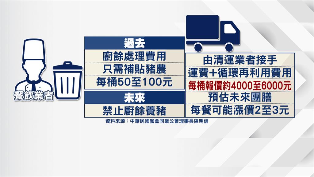 團膳業者指出,過去廚餘多由豬農自行前來載運,業者只需補貼每桶約50至100元,如今改由清運業者接手,運費加上循環再利用等費用,初估每桶成本約落在4000至6000元之間,預估營養午餐每餐可能因此調漲2至3元。業者也憂心,若未來清運量能供不應求,清運成本進一步墊高,相關費用恐轉嫁給消費者,餐費還有再調整的壓力。