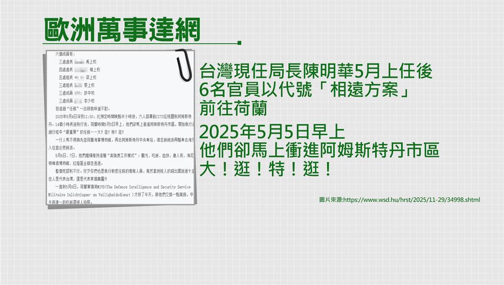 網上瘋傳「台荷情報交流資訊」,班機資訊、會議資料等全被公開。圖/台視新聞爆料文章稱在現任局長陳明華5月上任後,有6名官員以代號「相遠方案」,在今年5月8日到荷蘭進行情報交流,還寫到他們前2天在旅遊購物;另外也寫到今年11月荷蘭兩大情治單位,也派6人小組來台人員、會議內容,同樣鉅細靡遺地公布。