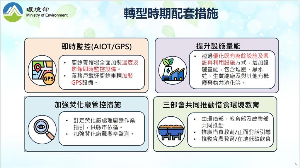 環境部宣布轉型期間配套措施。圖/環境部提供教育部、衛福部、農業部及環境部等各部會協力規劃推廣惜食教育,宣導減少食物浪費。最後,行政院長卓榮泰也特別拜託各縣市政府,合力面對未來可能的焚化廠歲修或突發狀況,做好區域聯防的工作。