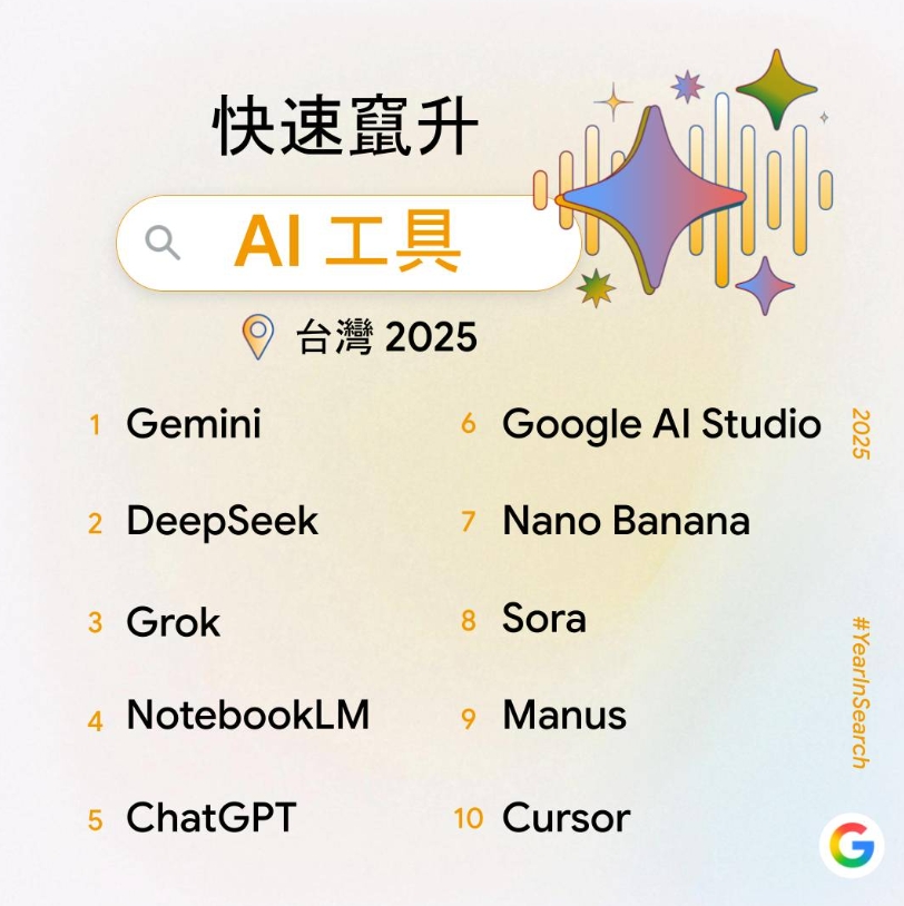 Google公布2025年度搜尋排行榜,揭露台灣人在這一年中最多搜尋的人物、政策、關鍵字,當中在「快速竄升 AI 工具」榜單中,Google的Gemini奪下第一名,隨後分別是DeepSeek、Grok、NotebookLM、ChatGPT、Google AI Studio、Nano Banana、Sora、Manus、Cursor。