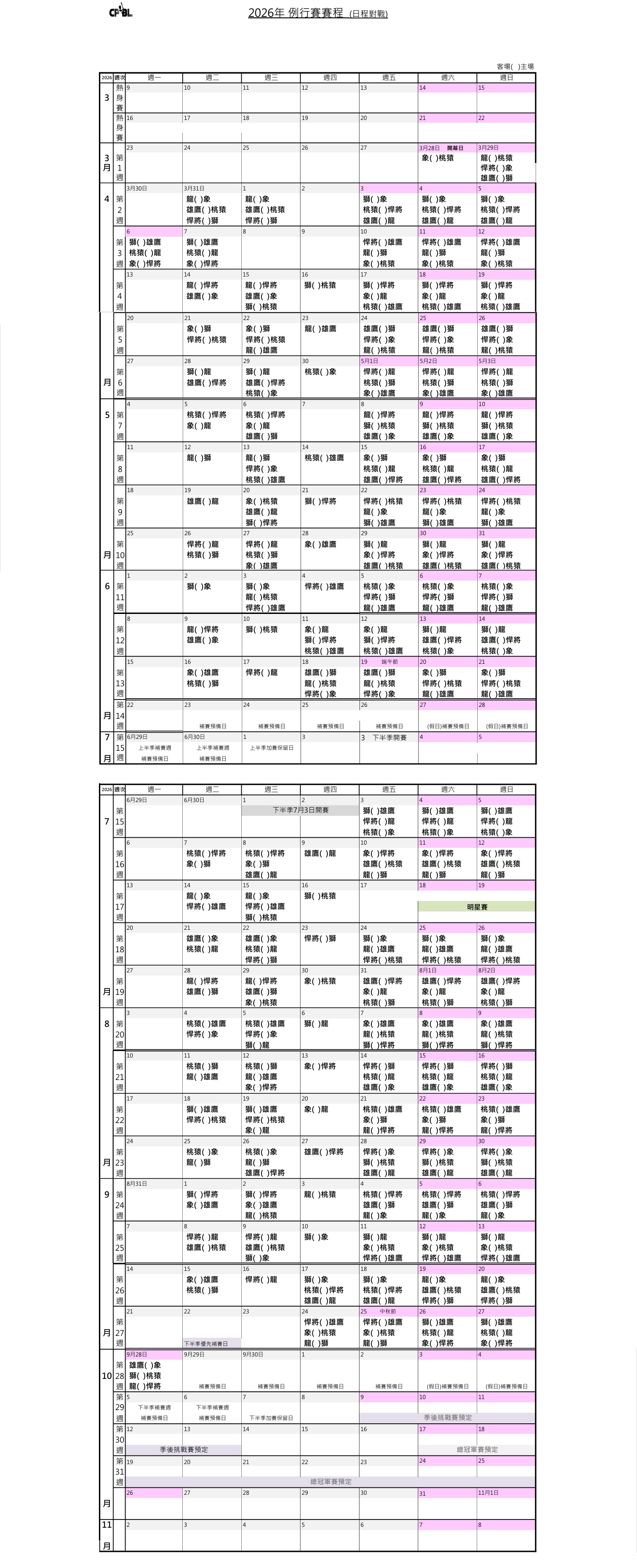 中職樂天桃猿奪下今年度總冠軍。圖/翻攝自CPBL中華職棒臉書(資料畫面) 中華職棒今(4)日公布2026年例行賽賽程,明年3月28日開幕戰將上演「象猿大戰」,場地目前尚未定案。聯盟並定於7月18、19日明星賽週,10月進入季後賽與總冠軍賽賽程。中職2026年賽程(點圖放大)中職2026年賽程。圖/中職提供責任編輯/洪季謙