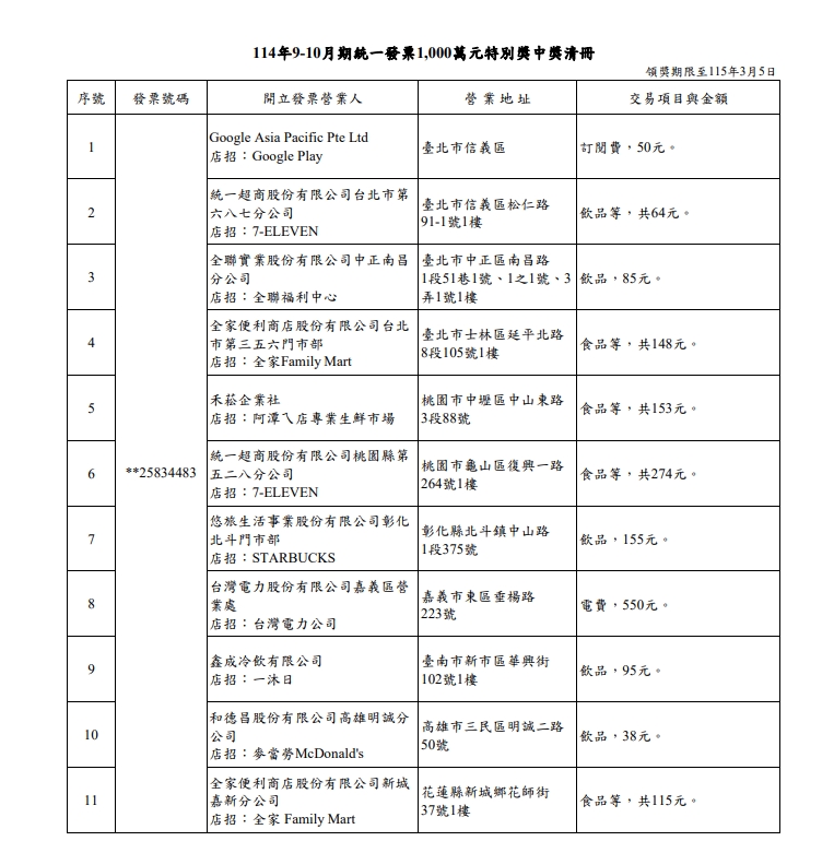 財政部11月25日公開「114年9-10月統一發票」中獎號碼,今(4)日更是公開了詳細中獎清冊,本期千萬大獎共11人中獎,其中一人在高雄三民區一間麥當勞用38元購買飲料就幸運中大獎。
