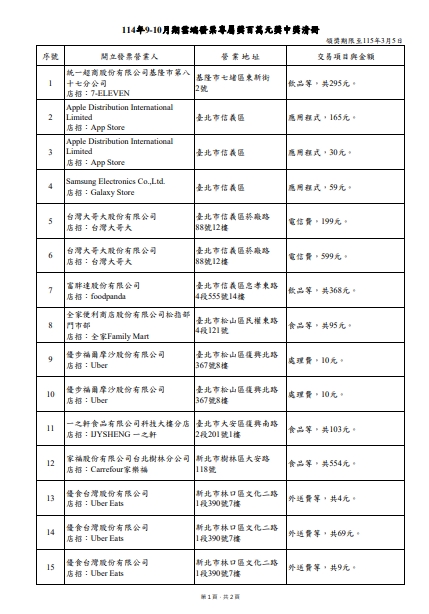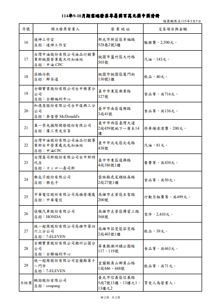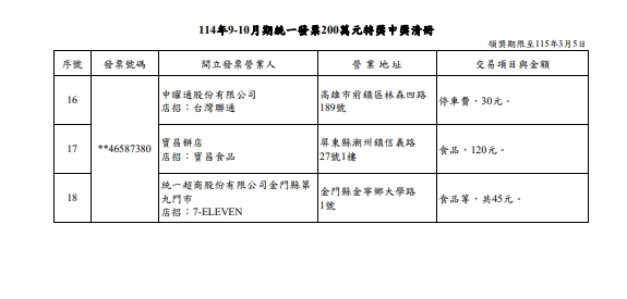 千萬特別獎中獎清冊。圖/財政部提供根據財政部公布資料,「114年9-10月統一發票」千萬大獎共11人中獎,200萬特獎部分共有18人中獎,其中2人僅花費30元停車費就幸運中獎,兩張發票分別開在高雄、台南兩地。
