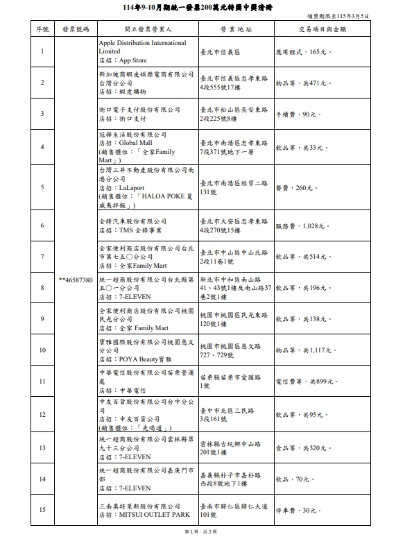200萬特獎中獎清冊。圖/財政部提供雲端發票專屬百萬獎部分,此次共有30人中獎,但其中1人因為買受人為營業人不給獎,另外有2人分別花4元、9元外送費就幸運得獎。提醒大家,本次發票領獎期間為114年12月6日至115年3月5日止。
