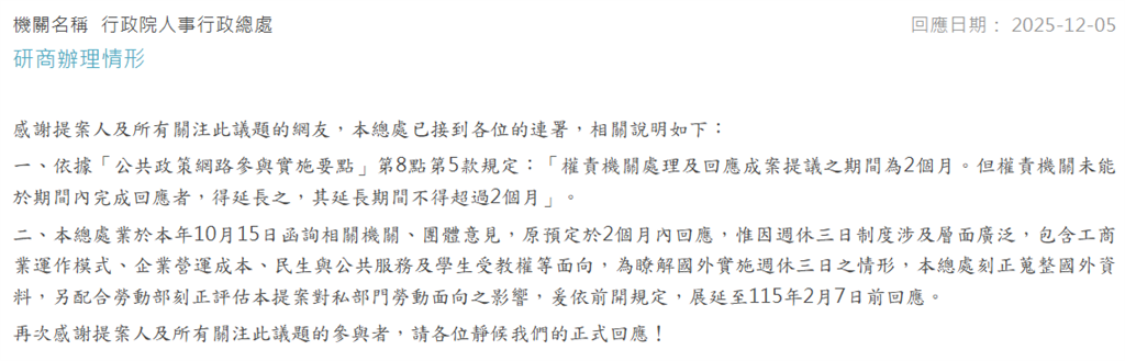 行政院人事行政總處也在網站中說明,10月15日函詢相關機關、團體意見,原預定於2個月內回應,惟因週休三日制度涉及層面廣泛,包含工商業運作模式、企業營運成本、民生與公共服務及學生受教權等面向,為瞭解國外實施週休三日情形,刻正蒐整國外資料,另配合勞動部評估本提案對私部門勞動面向影響,展延至115年2月7日前回應。