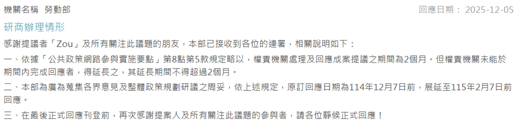 勞動部說明,為廣為蒐集各界意見及整體政策規劃研議之周妥,原訂回應日期為114年12月7日前,展延至115年2月7日前回應。並再次感謝提案人及所有關注此議題的參與者,請各位靜候正式回應。
