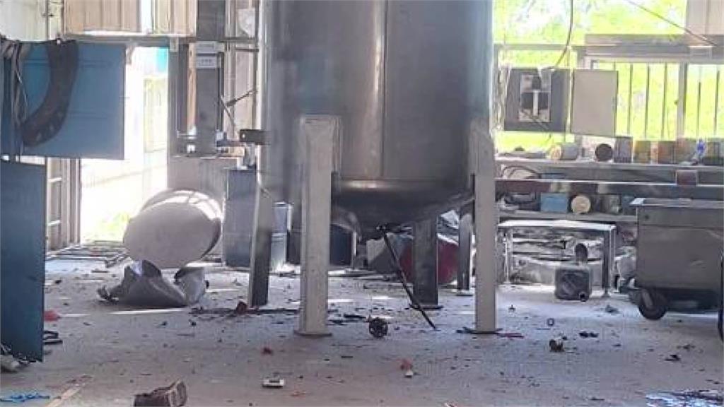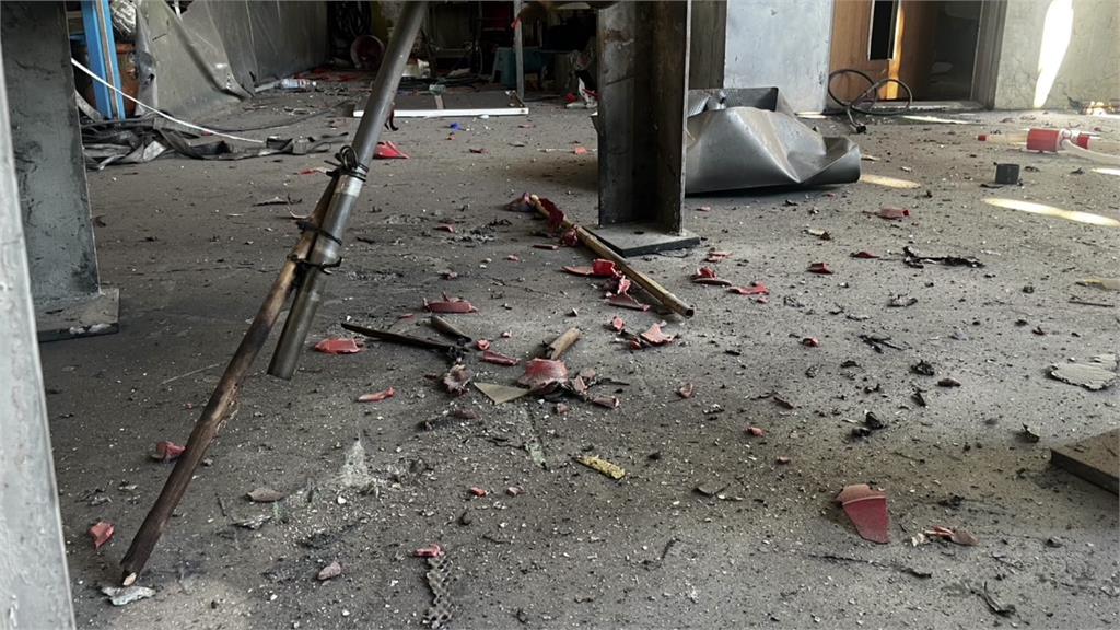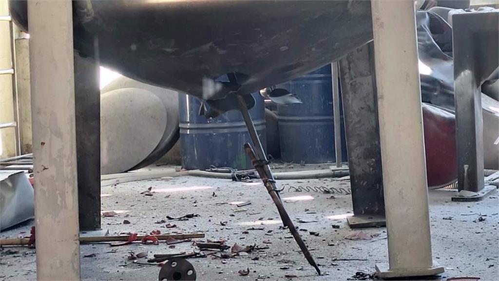 化學槽被炸出一個大洞,現場碎片散落一地。圖/台視新聞金屬桿長型掃把清掃 結晶體疑因磨擦釀火花