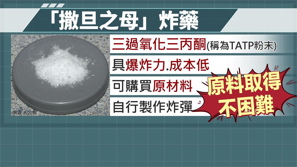「撒旦之母」三過氧化三丙酮(TATP)是此次爆炸案的元兇。圖/台視新聞製圖桃園/林注強、高妍柔、史言川 責任編輯/網路中心