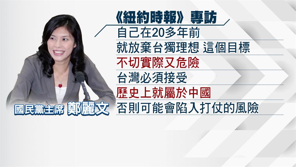 紐時發布專訪,標題內容竟是《曾支持台獨的台灣反對黨領袖,如今轉向中國》,措辭相當重,因為鄭麗文在專訪中指出,台灣應該與北京和解,就連美國總統川普也會認同她的觀點,而她自己在20多年前就放棄台獨理想,只因這個目標「不切實際又危險」,台灣必須接受「歷史上就屬於中國」,否則可能會陷入戰爭風險。