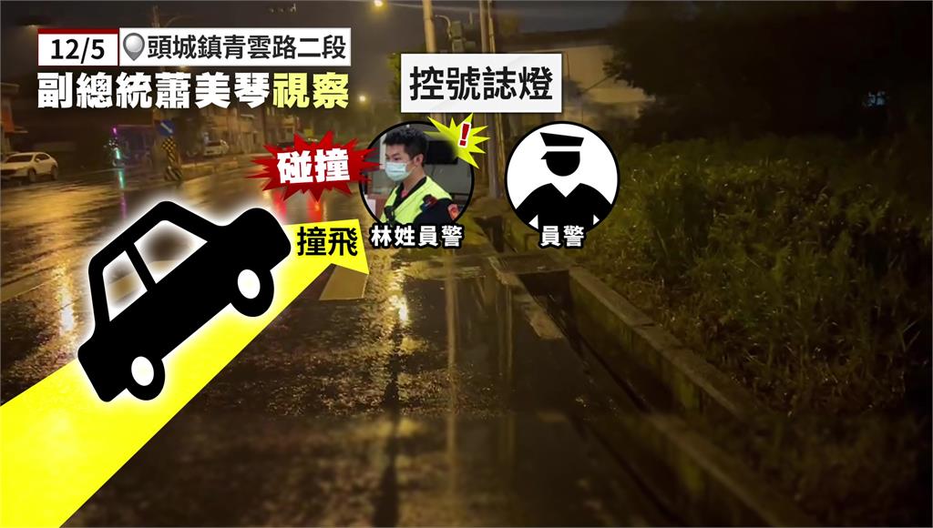 蕭美琴5日晚上6點半左右到頭城視察,原本休假中的林姓員警跟同事,兩人被分派到青雲路二段控制燈號,沒想到碰上莫名的車禍,只見黑色廂型車車速緩慢,開到一半往左偏了一下,到路口突然偏右重重撞上路口兩名執勤的員警。