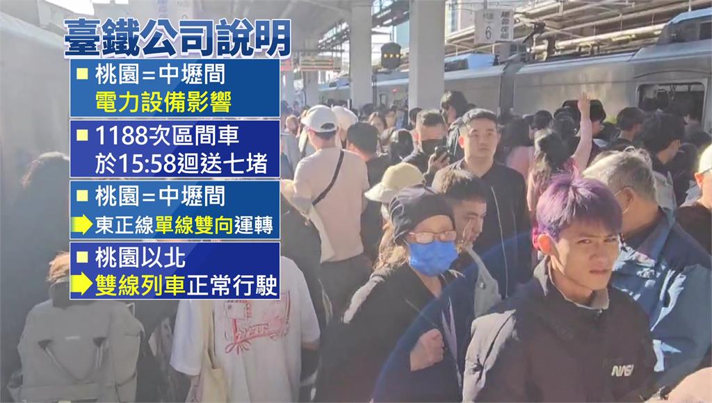 月台、車廂內的乘客幾乎動彈不得。圖/台視新聞今日下午1點多,台鐵中壢至桃園間電力設備突然故障,只能改採「單線雙向行車」,導致列車大幅延誤。正逢假日期間,許多旅客搭火車出遊或返鄉,西正線列車因停電,全數停靠在桃園站,行程被迫打亂。旅客氣憤直呼,「太衰了吧!想回個家怎麼這麼難!」
