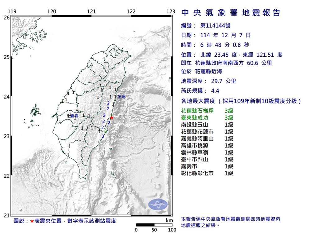 今(7)日上午6時48分花蓮縣近海(花蓮縣政府南南西方60.6公里)發生規模4.4地震,地震深度29.7公里,最大震度位於花蓮縣、台東縣的3級,全台共9縣市有感。各縣市震度分別為,花蓮縣3級、台東縣3級、南投縣1級、嘉義縣1級、高雄市1級、雲林縣1級、台中市1級、嘉義市1級及彰化縣1級。地震報告。圖/中央氣象署提供責任編輯/周瑾逸