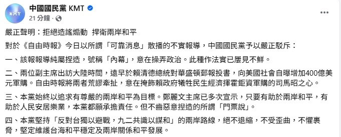 國民黨表示,對於《自由時報》今日以所謂「可靠消息」散播的不實報導,中國國民黨予以嚴正駁斥,並痛批該報導純屬捏造,「號稱『內幕』,意在操弄政治。此種作法實已屢見不鮮」。